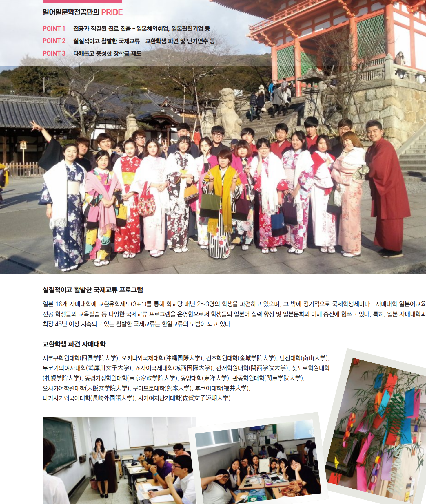 | 일본비즈니스 과정 | 일본어와정보처리연습, 실용일본어회화, 시사일본어, 일본어프레젠테이션, 실용비즈니스일본어, 일본어커뮤니케이션, 일본취업세미나 |